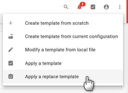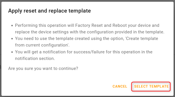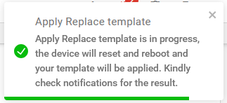 Selecting Apply a replace template modifies and replaces all settings on the target device when the template is applied. The non-default settings in the template will modify those settings on the target device, and all other settings on the target device will return to their default configuration.