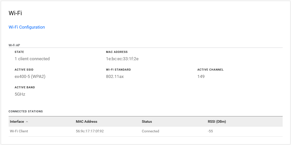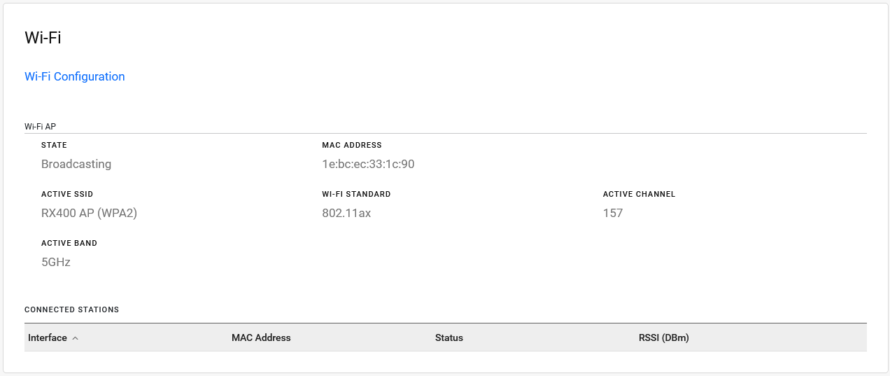Additionally, you can go to Status > System > Wi-Fi to view detailed Wi-Fi Access Point status, including the active channel and connected stations (clients).