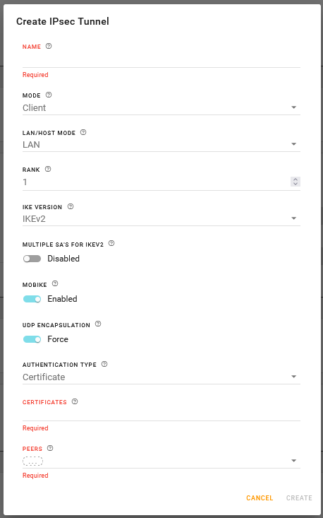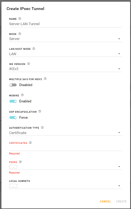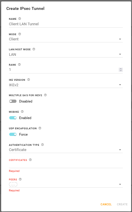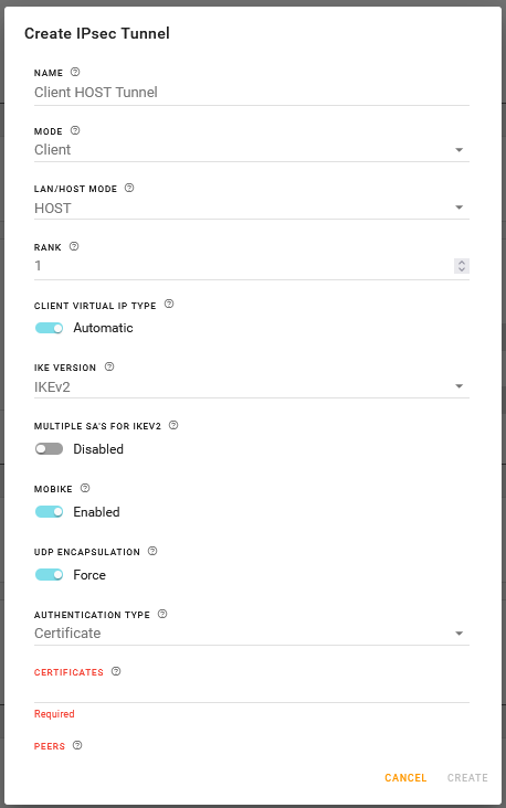 Required to identify the peer side of a VPN connection. This is the primary peer (see SECONDARY PEER FOR FAILOVER below) and can be an IP address or an FQDN. Select a pre-configured FQDN, IP/Network or System IP/Network, or click CREATE to configure an FQDN or IP/Network. Note: Server mode allows only one peer for each tunnel configuration. If you require multiple clients to access the router VPN server, then you must configure additional VPN tunnels on the router. |
