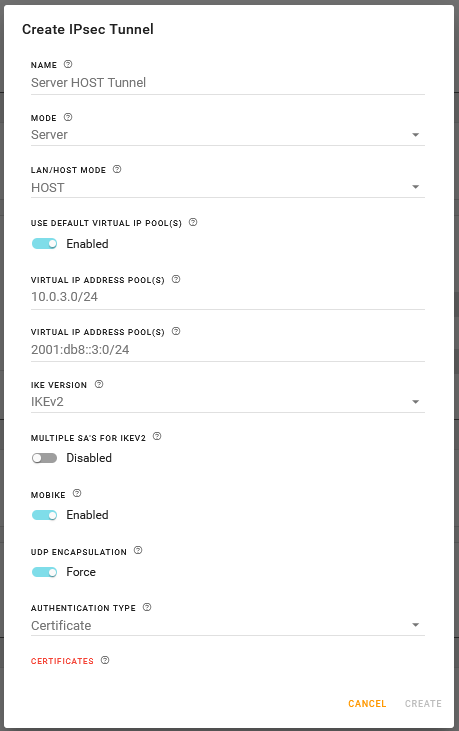 | USE DEFAULT VIRTUAL IP POOL(S) | Appears when the tunnel is being configured for Server/HOST mode. | Enabled | Enabled, Disabled |