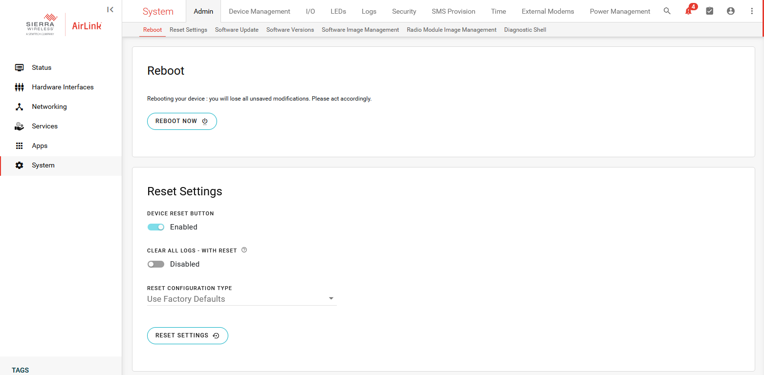 Under System you can manage software updates, retrieve device logs, configure system time, configure the device’s LED behavior, and configure user accounts.
