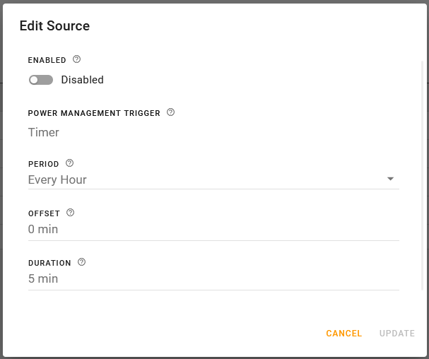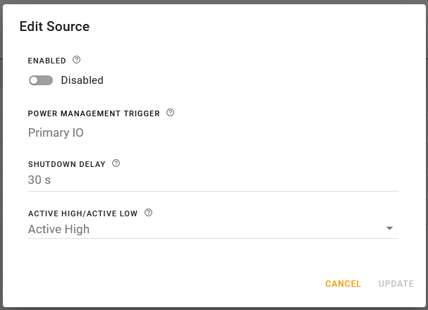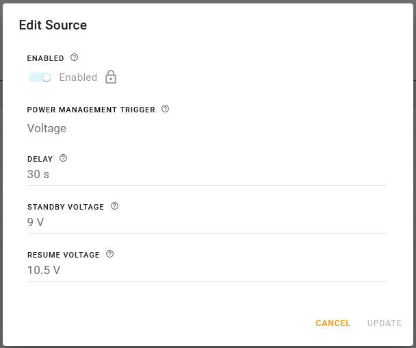 In Edit Source, set a DELAY, which is the time period (in seconds) that the voltage to the router must drop below the STANDBY VOLTAGE before the router goes into standby mode.