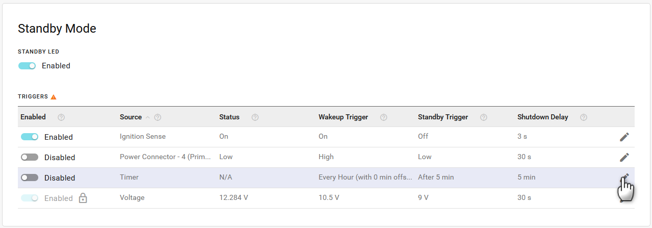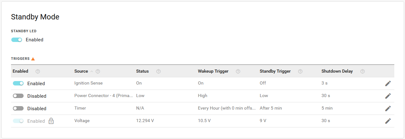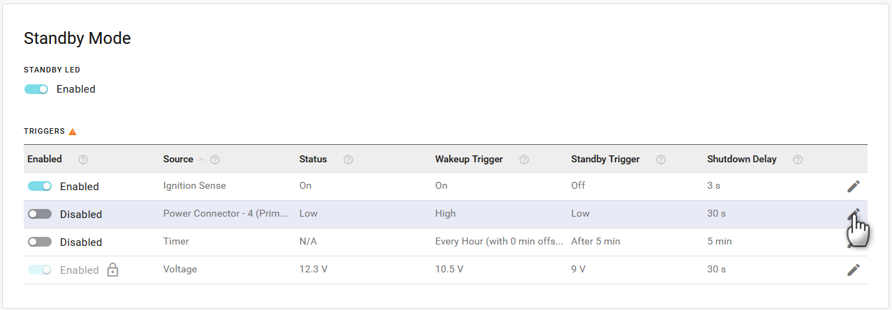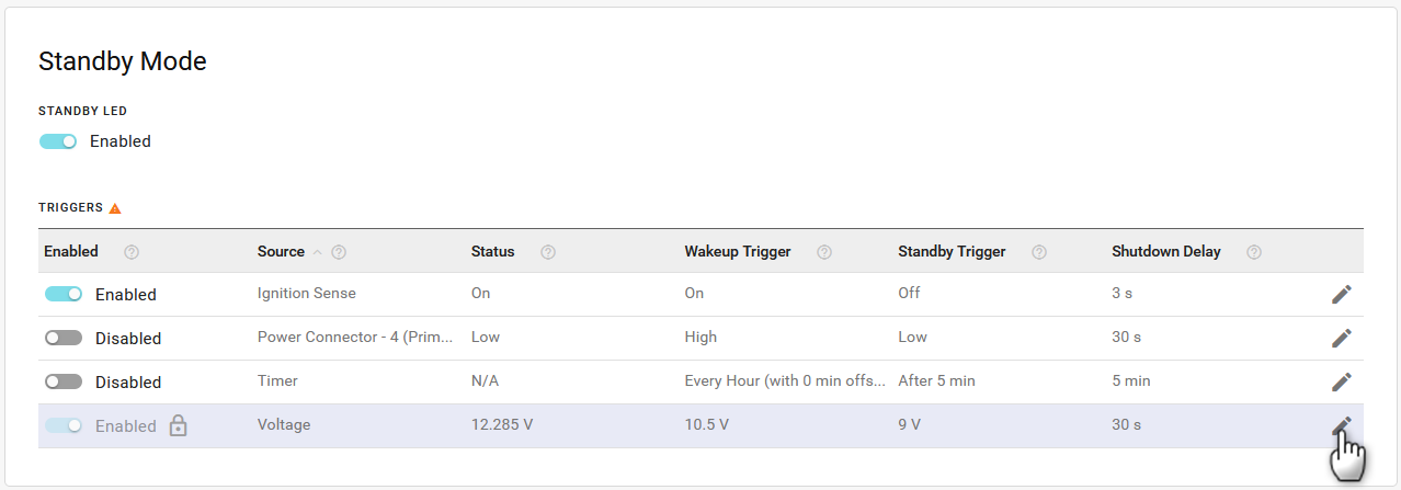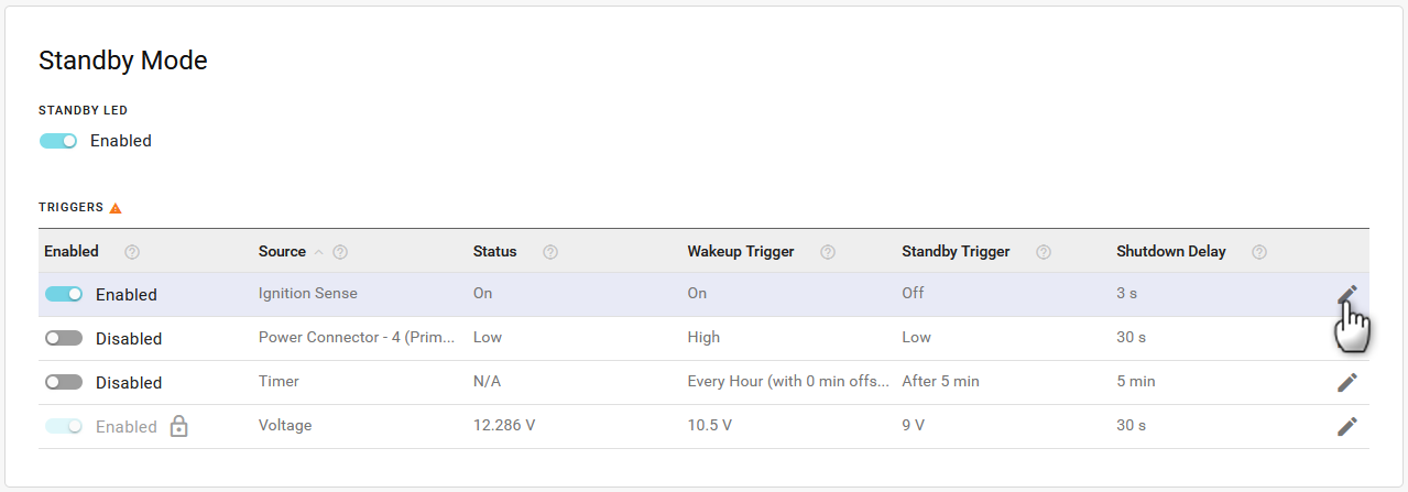 The TRIGGERS table lists the configurable trigger sources that control how the router enters and exits standby mode. You can enable or disable each trigger (except Voltage) from the table, or click Edit (