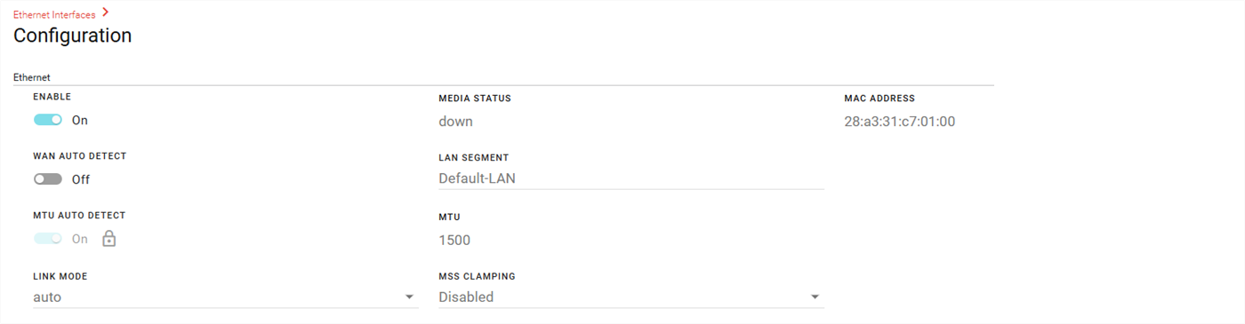 For more detail, click on an Ethernet Port entry on the dashboard, and it will automatically take you to the Hardware Interfaces > Ethernet Interfaces > Configuration section.