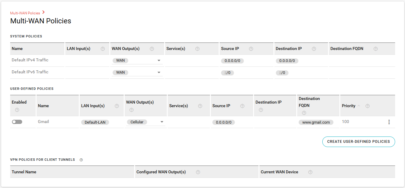WAN Output(s): Specifies the ordered list of interfaces the traffic can be carried over. This can be configured using a Zone or specific WAN interfaces. Default policies use the WAN zone to define the default device order. The default device preference is Ethernet, Wi-Fi, Cellular, and finally USB interfaces (USB interfaces may not be implemented yet).