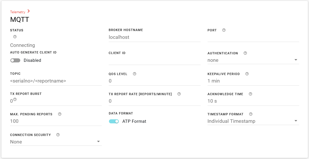 Under Telemetry > MQTT, configure the connection to your MQTT server. See Configuring Telemetry for more information about MQTT settings.