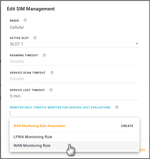 This setting is available when SERVICE LOST TIMEOUT is configured. Select an associated Network Watchdog Monitor Rule that will trigger the SERVICE LOST TIMEOUT to start. Click CREATE to create a new monitor rule. The Monitor Rule must monitor the Cellular interface. To configure a Monitor Rule, see Configuring the Network Watchdog.