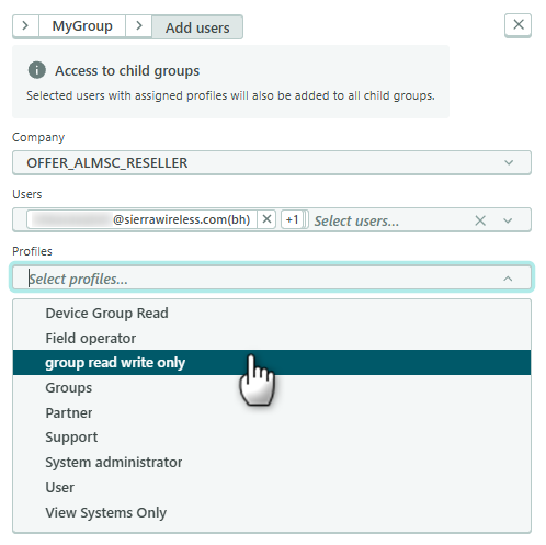 Administrators and users with “Groups Write” permission can add users to a Group. You can add users from your company and any partnered companies. The process of adding users also includes adding profiles to those users to control who can view or edit the Group, and control what users can do to the systems within the Group.