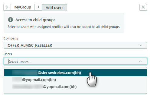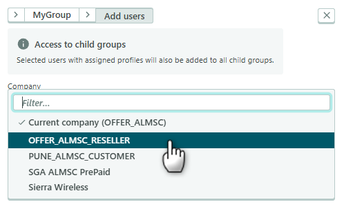 In the Add users panel, under Company, select the company from which you want to add users. Click Filter… to search for a specific partnered company.