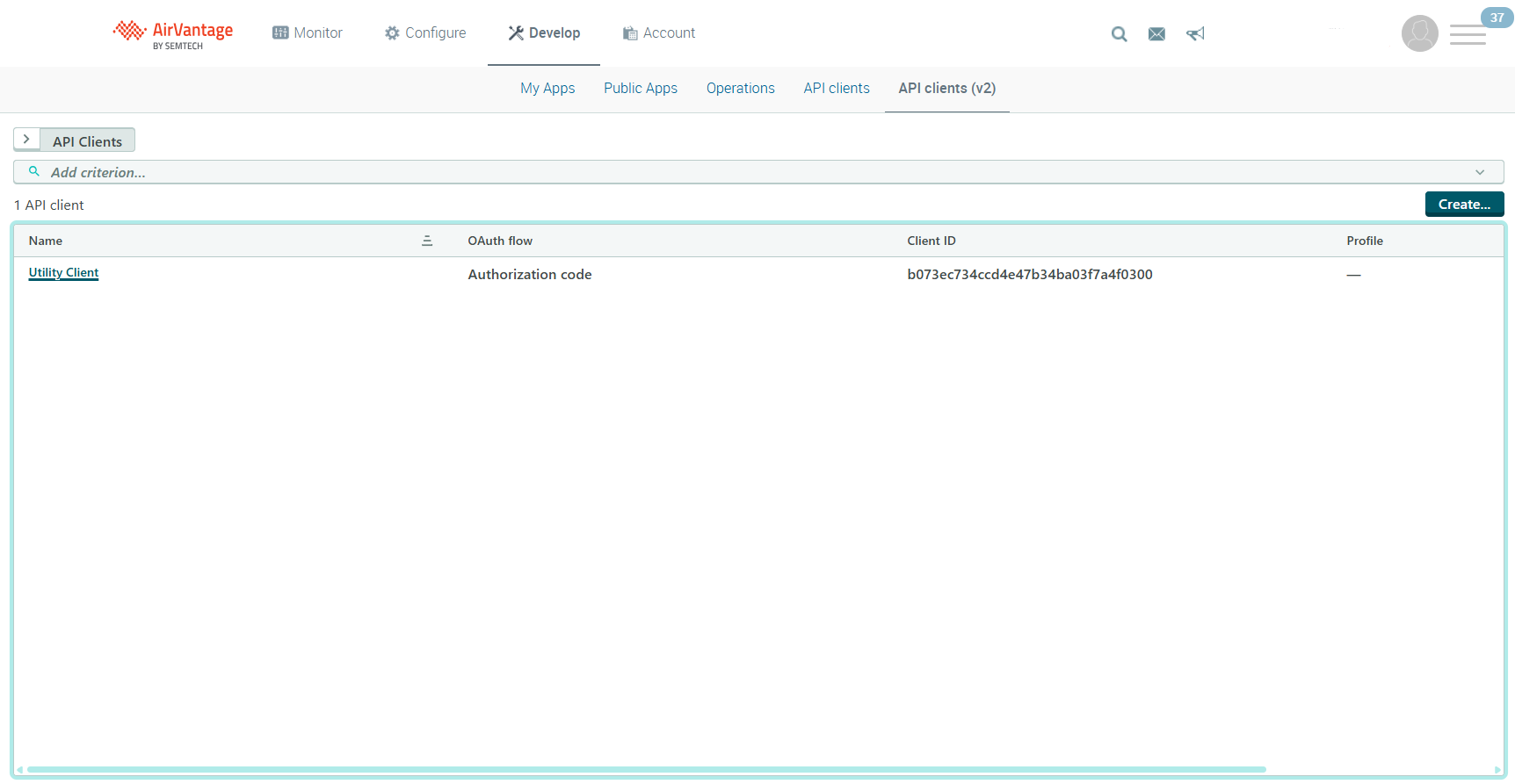 If you are a developer this is where you can release your embedded applications and publish them to make them available to AirVantage users. When needed you can also share them with partners of your company. It also includes a section to create a new AirVantage Web API client and the reference documentation of the Web API (HTTP REST).