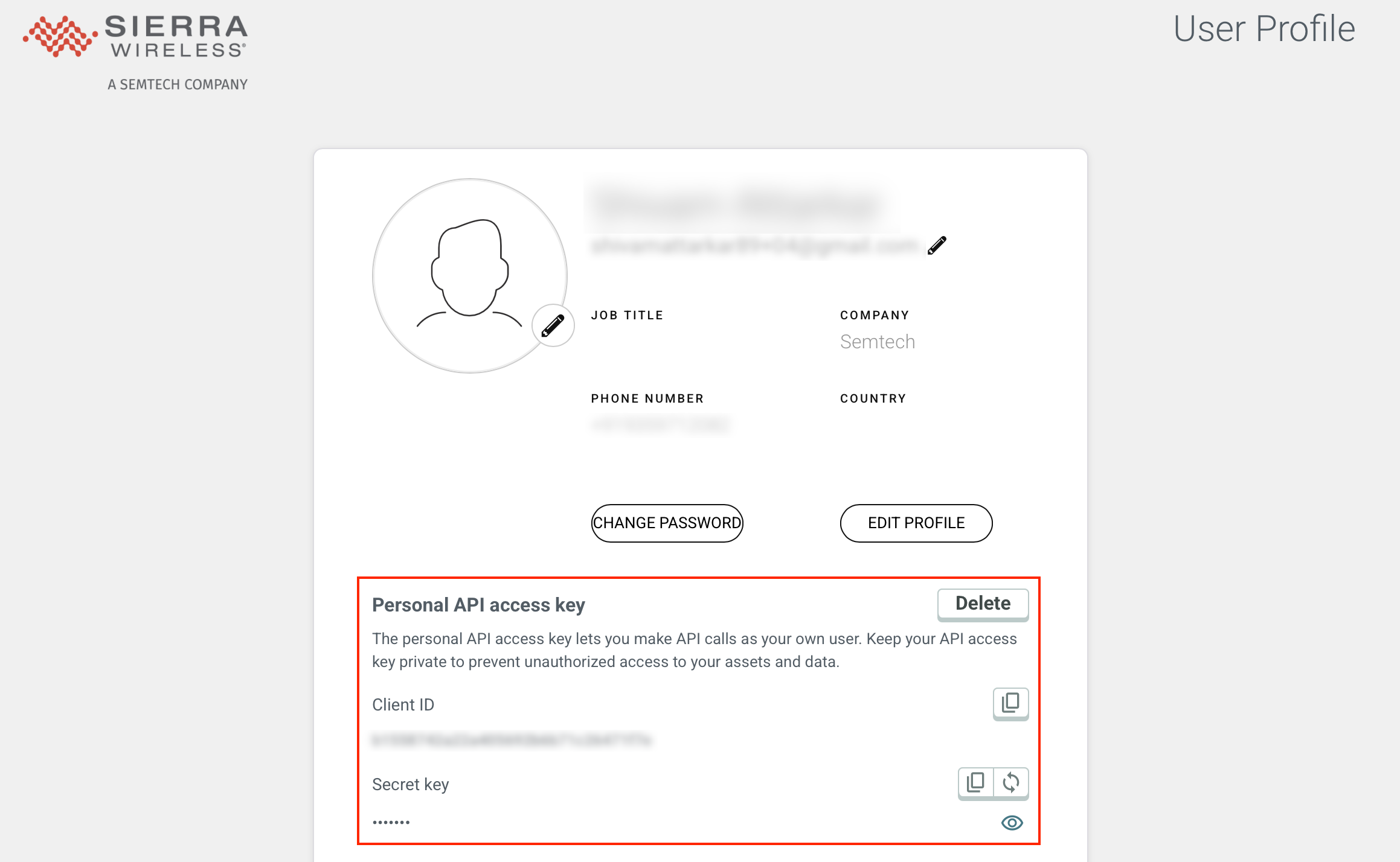 2. In the Personal API access key section, click Delete. A prompt will be displayed to confirm whether you want to delete the personal API access key.